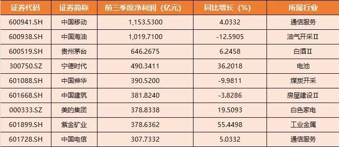 前三季度凈利潤金額居前的上市公司