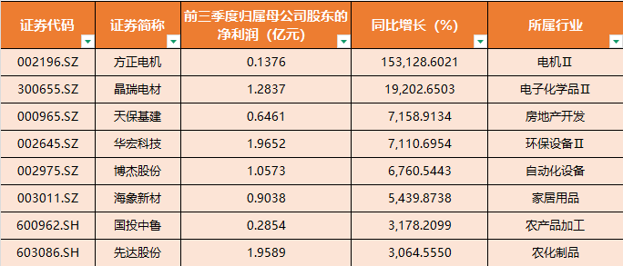 從凈利潤增幅來(lái)看,上述5385家上市公司中,有2325家公司前三季度凈利潤同比增超10%,1626家公司同比增超30%,677家公司同比增超100%。剔除扭虧影響,方正電機(002196)、晶瑞電材(300655)、天;(000965)、華宏科技(002645)、博杰股份(002975)、海象新材(003011)、國投中魯(600962)、先達股份(603086)等公司前三季度凈利潤同比增幅超過(guò)3000%。