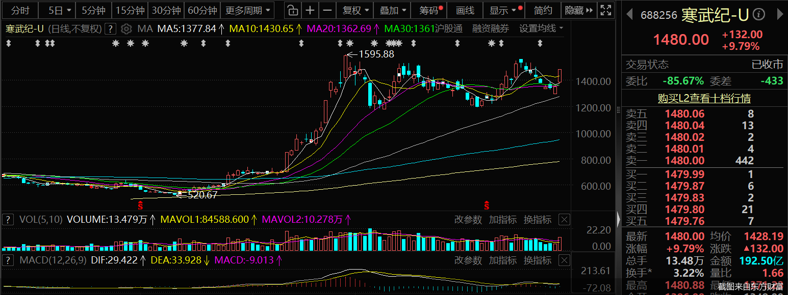 截至目前,陳天石持有寒武紀28.35%的股份。二級市場(chǎng)上,11月6日,寒武紀盤(pán)中股價(jià)大漲,最終收漲9.79%,報1480元/股,再度超越貴州茅臺(600519)收盤(pán)價(jià),最新總市值約為6240.94億元。拉長(cháng)時(shí)間線(xiàn)來(lái)看,8月1日—11月6日,這64個(gè)交易日內,寒武紀區間累計漲幅108.6%,同期大盤(pán)漲幅12.16%。
