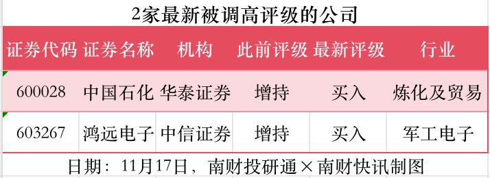 評級調高方面,11月17日,券商調高上市公司評級達到2家次,最新數據包括了華泰證券對中國石化的評級從“增持”調高至“買(mǎi)入”,中信證券對鴻遠電子(603267)的評級從“增持”調高至“買(mǎi)入”。