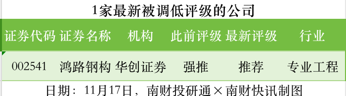 評級調低方面,11月17日,券商調低上市公司評級達到1家次,最新數據包括了華創(chuàng )證券對鴻路鋼構的評級從“強推”調低至“推薦”。
