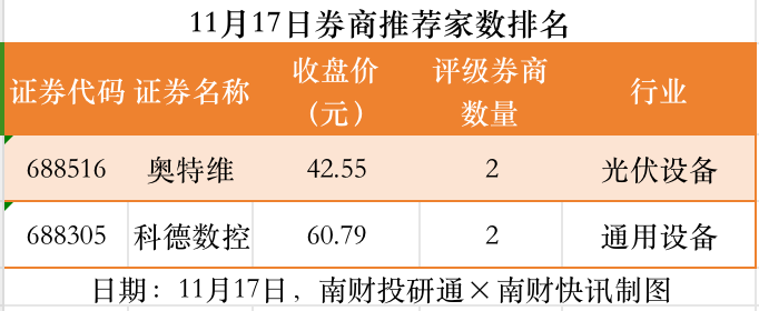 從券商推薦家數來(lái)看,11月17日有51家上市公司得到券商推薦,其中奧特維獲得2家推薦,科德數控獲得2家推薦。
