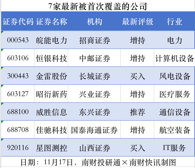 首次覆蓋方面,11月17日券商共給出了7次首次覆蓋,其中皖能電力(000543)獲得招商證券給予“增持”評級,恒銀科技(603106)獲得中郵證券給予“增持”評級,金雷股份(300443)獲得長(cháng)城證券(002939)給予“買(mǎi)入”評級,昭衍新藥(603127)獲得興業(yè)證券給予“增持”評級,威勝信息獲得東興證券給予“推薦”評級。