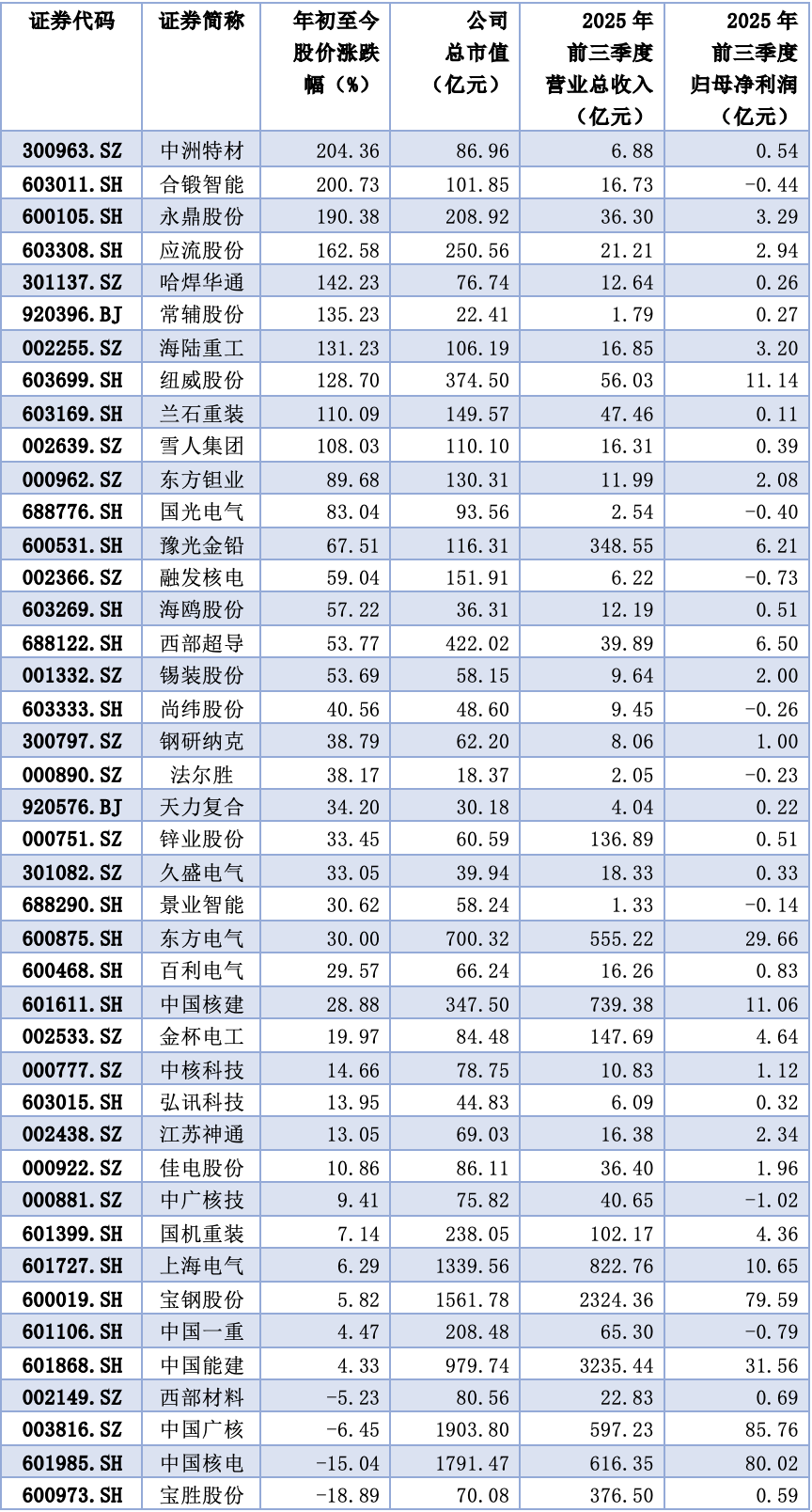 從股價(jià)走勢來(lái)看,據統計數據,2025年年初至11月24日期間,中洲特材股價(jià)漲幅最高,達204.36%,緊隨其后的是合鍛智能,股價(jià)漲幅為200.73%,此外漲幅實(shí)現翻倍的個(gè)股共有8只。股價(jià)呈下滑走勢的個(gè)股共有4只,依次為西部材料(002149)(002149.SZ)、中國廣核(003816)(003816.SZ)、中國核電(601985)(601985.SH)、寶勝股份(600973)(600973.SH),其中寶勝股份降幅最大,年內下降18.89%。