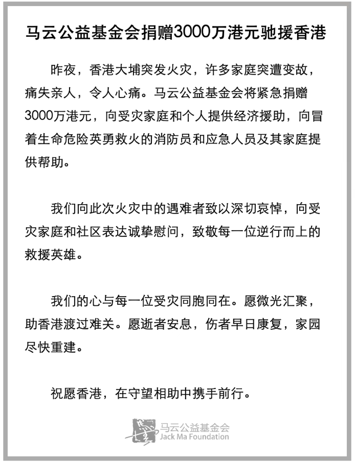 馬云公益基金會(huì )宣布緊急捐贈3000萬(wàn)港元,向受災家庭和個(gè)人提供經(jīng)濟援助,向冒著(zhù)生命危險英勇救火的消防員和應急人員及其家庭提供幫助。