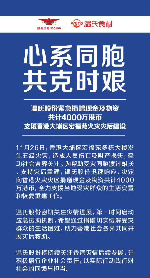 溫氏股份宣布向香港火災災區捐贈現金及物資共計4000萬(wàn)港幣,全力支援當地受災群眾的生活安置和恢復重建工作。