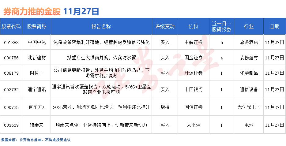 據證券之星數據庫不完全統計,11月27日券商共給予近10家A股上市公司“買(mǎi)入”評級。從行業(yè)分布看,券商11月27日關(guān)注的個(gè)股聚焦于旅游酒店、裝修建材、化學(xué)制品、通信設備、光學(xué)光電子、電池等行業(yè)。