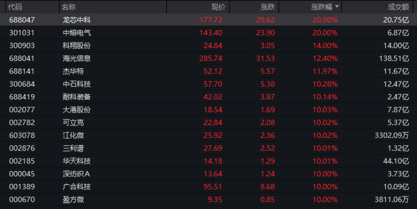 從行業(yè)板塊和賽道來看,若按照申萬(wàn)一級(jí)行業(yè)劃分,電子板塊領(lǐng)漲,板塊盤中漲幅超過2.8%,板塊內(nèi)個(gè)股掀起漲停潮。龍芯中科、中熔電氣(301031)“20cm”漲停,科翔股份(300903)、杰華特等多股漲幅超過10%,大港股份(002077)、江化微(603078)等10多只股票漲停。