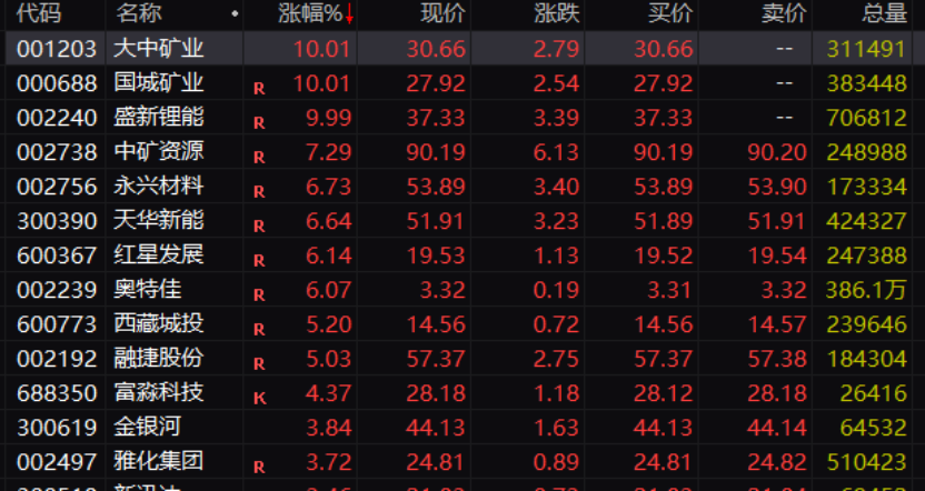 概念板塊方面,鋰礦概念板塊大漲,板塊盤中漲幅超過2%,大中礦業(yè)(001203)、圍城礦業(yè)、盛新鋰能(002240)等股票盤中漲停。消息面上,今天上午國(guó)內(nèi)碳酸鋰期貨大漲,主力合約盤中漲幅超過6%。